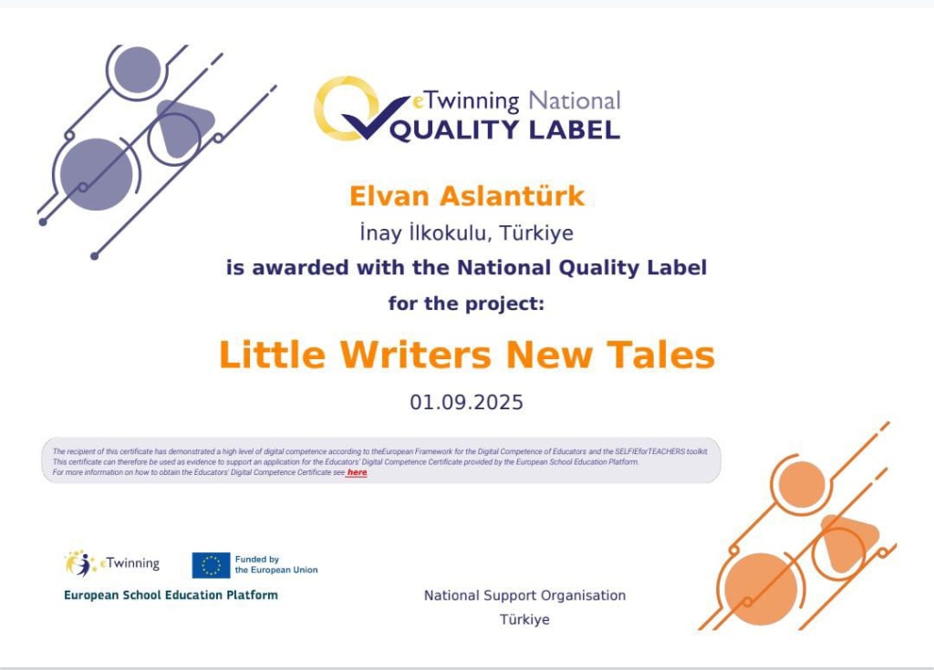 2024-2025 eğitim öğretim yılında okulumuz sınıf öğretmenlerinden Elvan Aslantürk, ortağı olduğu LITTLE WRITERS NEW TALES projesinde Ulusal Kalite Etiketi almaya layık görüldüler.